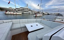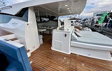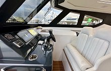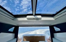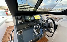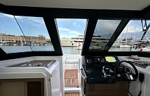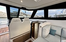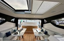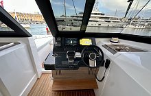 A huge aft sun lounger and a lifting aft platform add to the comfort. A roll-up bimini extends aft from the roof to provide shade. The forward cockpit is accessible from both the side decks and through a door in the superstructure and offers a 360-degree view.