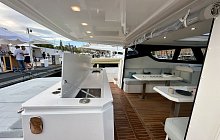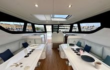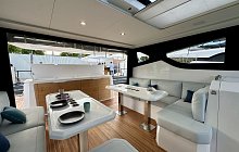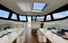 The superstructure is open to the aft decks, with the galley just forward of the sun lounger. Forward is a two-seater helm station and a sliding door that gives access to the forward cockpit. Further aft are the staircases leading to the hulls. The rearmost part of the superstructure has a sofa and a table on each side.