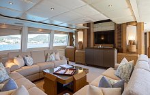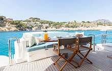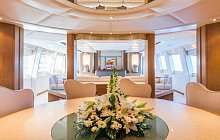 From the moment you walk onboard you will enter an area of calm. The soft and light feel in the aft dining room will welcome you to spend time with family and friends, to enjoy amazing food, fine wine and great conversation, late into the night.